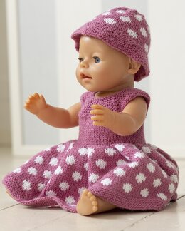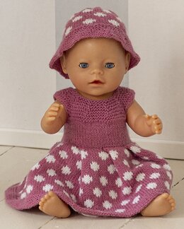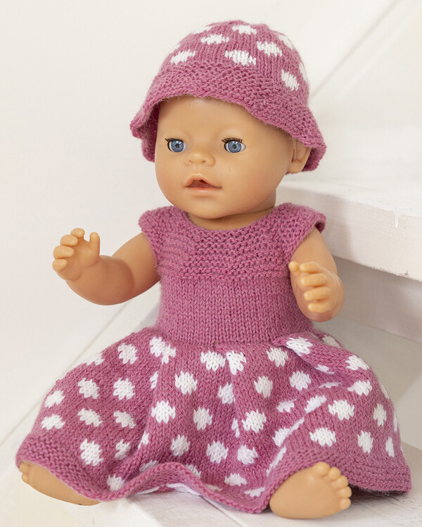 Ett gulligt stickmönster på en dockklänning med matchande hatt i prickigt mönster. Designen är enkel och dekorativ, perfekt för små detaljer.
