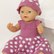 Ett gulligt stickmönster på en dockklänning med matchande hatt i prickigt mönster. Designen är enkel och dekorativ, perf...