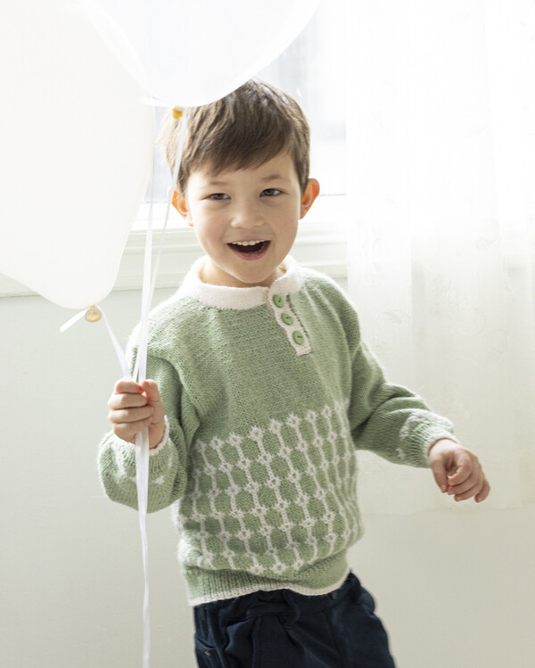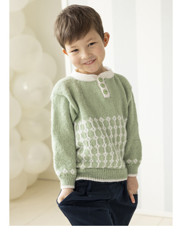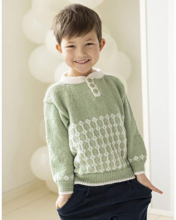 Ett stilrent stickmönster på en barntröja med dekorativt mönsterparti och knappdetalj vid halsen. Tröjan stickas i en klassisk passform som är bekväm att bära.
