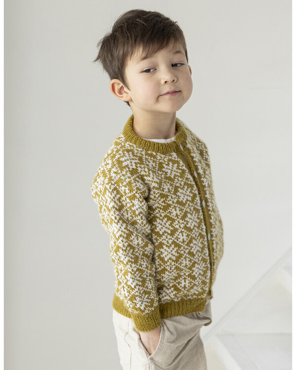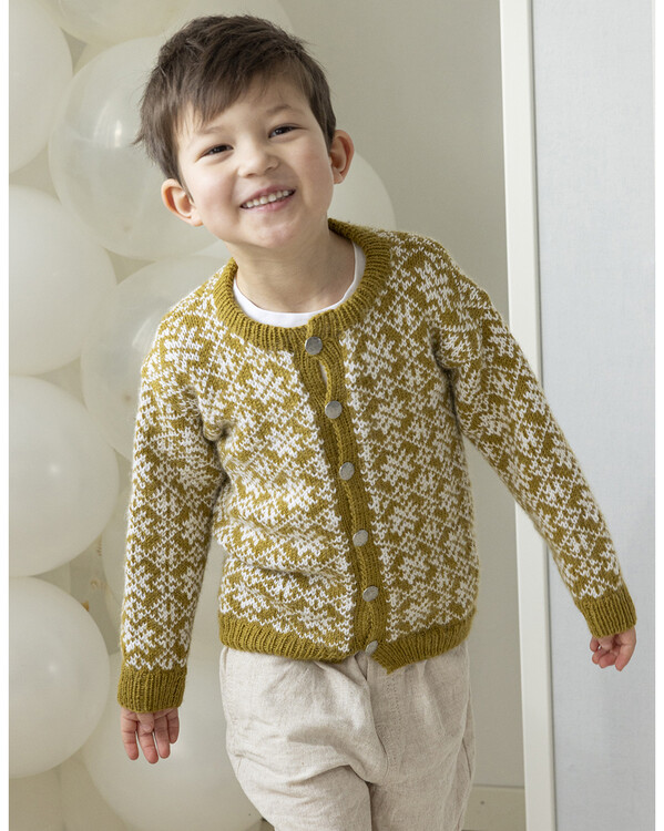 Ett härligt stickmönster på en barnkofta med dekorativt mönster i kontrastfärger. Koftan stickas med knäppning framtill och ger ett livfullt och klassiskt uttryck.