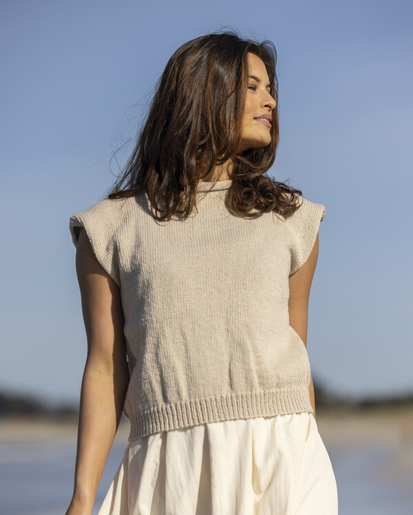Stickmönster till en ärmlös topp i mjuka naturtoner. En enkel och stilren topp som blir ett användbart plagg i garderobe...
