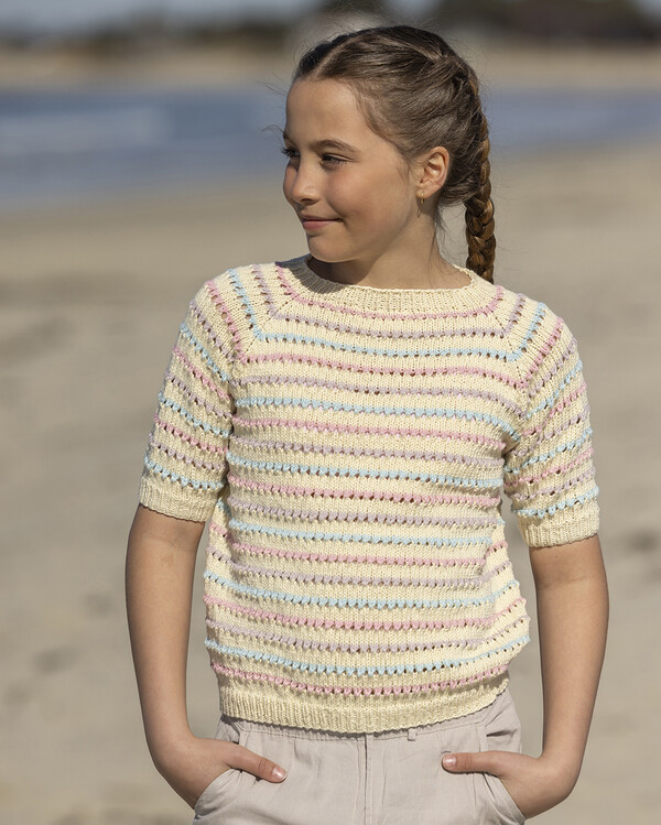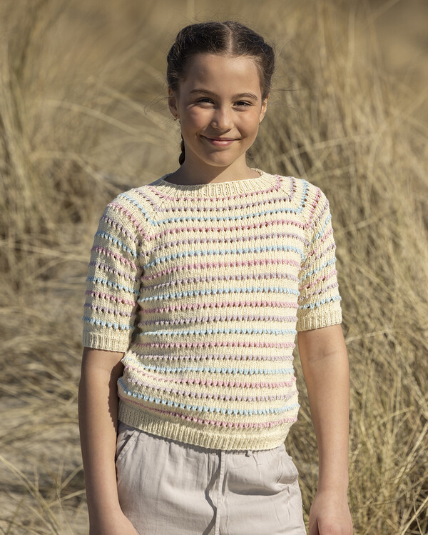 Stickmönster till en kortärmad barntröja med randigt mönster – ett perfekt plagg för vår och sommar.