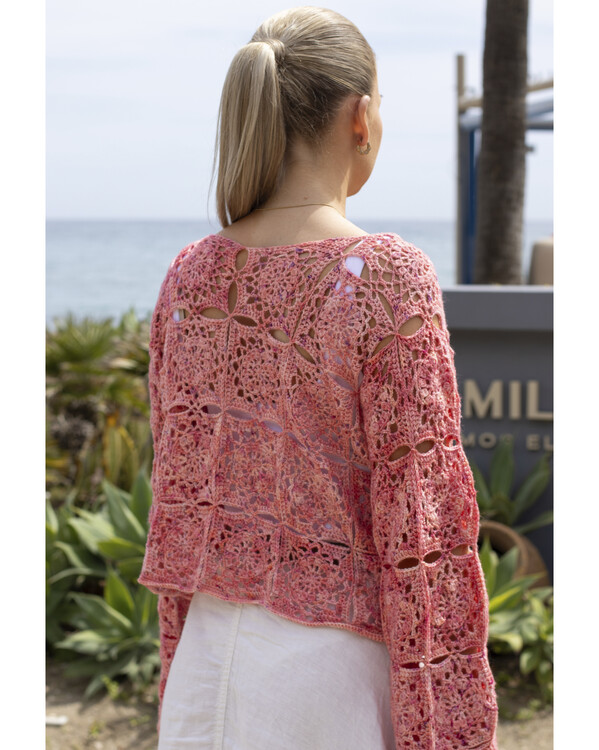 En luftig och romantisk virkad tröja i härliga rosa nyanser. Virkas i rutor som sätts ihop till en lätt och somrig modell med vida ärmar.