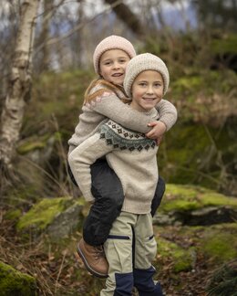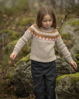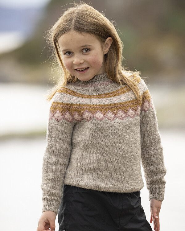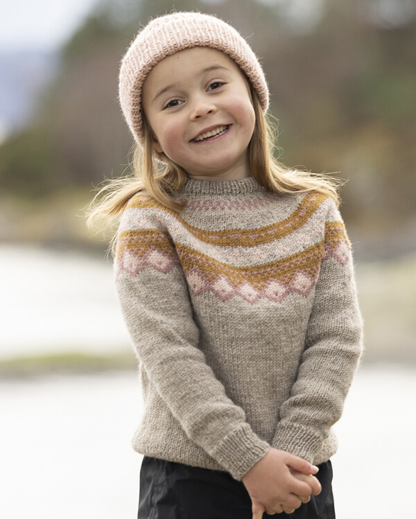 Sticka en mjuk och varm barntröja med detta charmiga stickmönster. Det rundstickade oket med diskret flerfärgsmönster ger ett klassiskt och lekfullt uttryck, perfekt för både vardag och utelek.