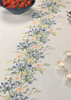 Broderas med moulinégarn i endast räknade korsstygn på blekt linne, 10 tr/cm eller vit aidaväv, 5,4 rutor/cm. Storlek ca 130x220 cm. Motivmått ca 125x26 cm.