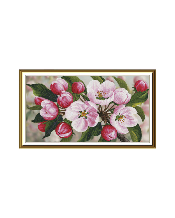 Ett ljust och vårigt korsstygnsmotiv med blommande äppelkvistar i rosa och vitt, omgivet av friskt gröna blad. Ett harmo...