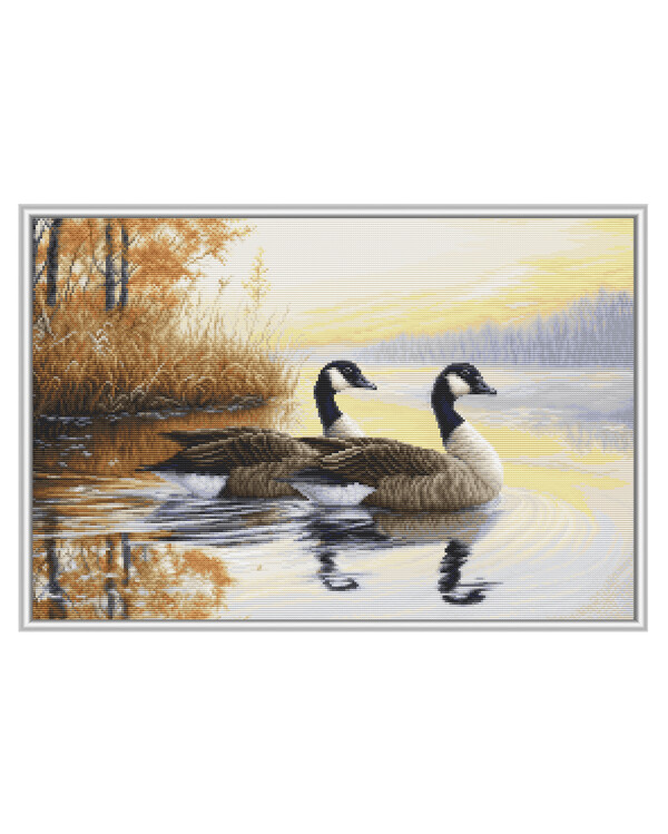 Ett stämningsfullt korsstygnsmotiv med två gäss som lugnt glider fram över spegelblankt vatten i ett mjukt gyllene ljus. Vassen och den stilla sjön skapar en harmonisk naturkänsla som ger ro och balans till hemmet.