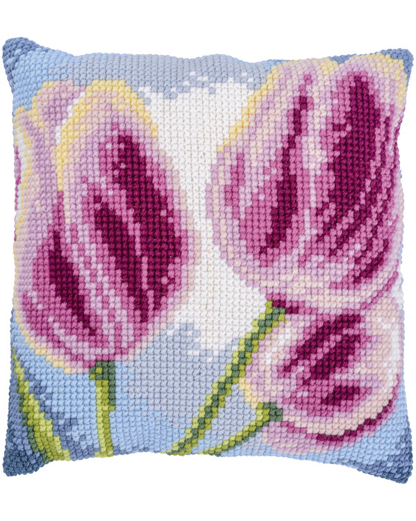 Fånga vårens skönhet med detta vackra broderikit där tre eleganta tulpaner står i centrum och skapar en dekorativ kudde som sprider färg och glädje i hemmet – oavsett årstid.