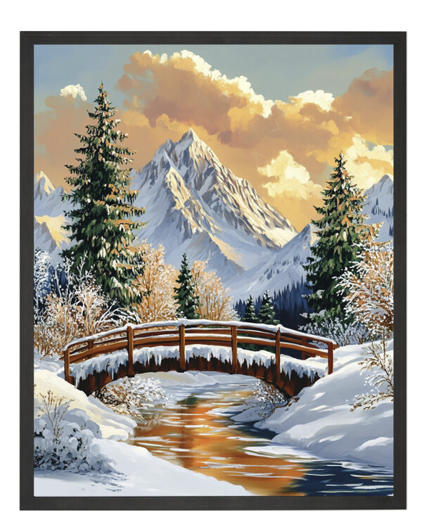 Ett stämningsfullt motiv med snötäckta träd, en träbro över en frusen bäck och mäktiga berg i solnedgångens varma ljus.