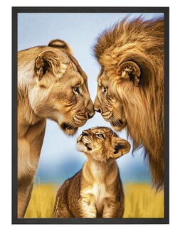 Ett hjärtevärmande motiv med ett lejonpar som nosar kärleksfullt mot varandra medan ungen tittar upp på dem. En vacker t...