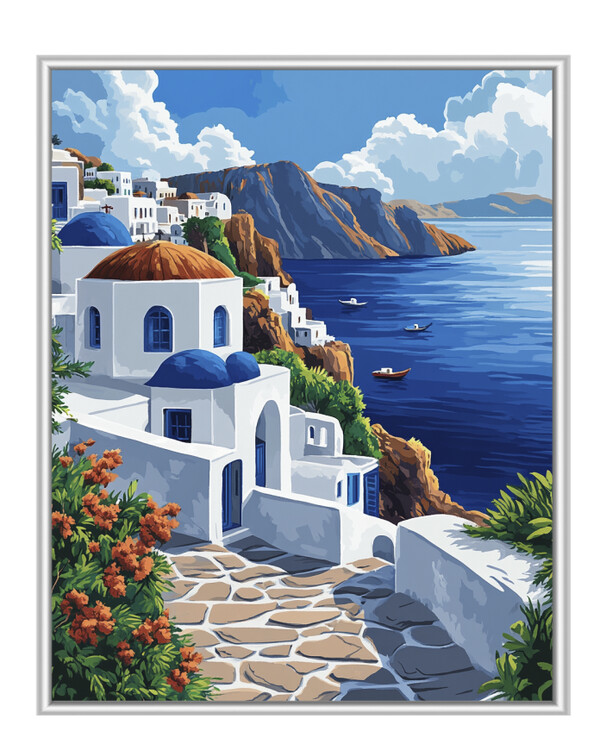 Ett ljus och färgstarkt motiv med vita hus och blå kupoler vid havet, inspirerat av den grekiska övärlden.