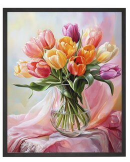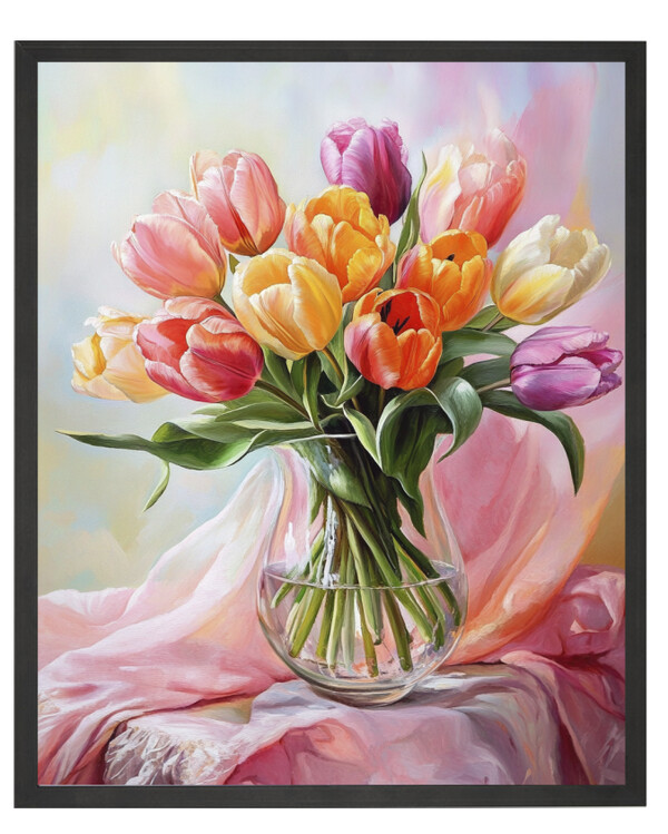 Ett elegant motiv med en bukett tulpaner i mjuka pastellfärger, arrangerade i en glasvas mot ett romantiskt tygdraperi. ...