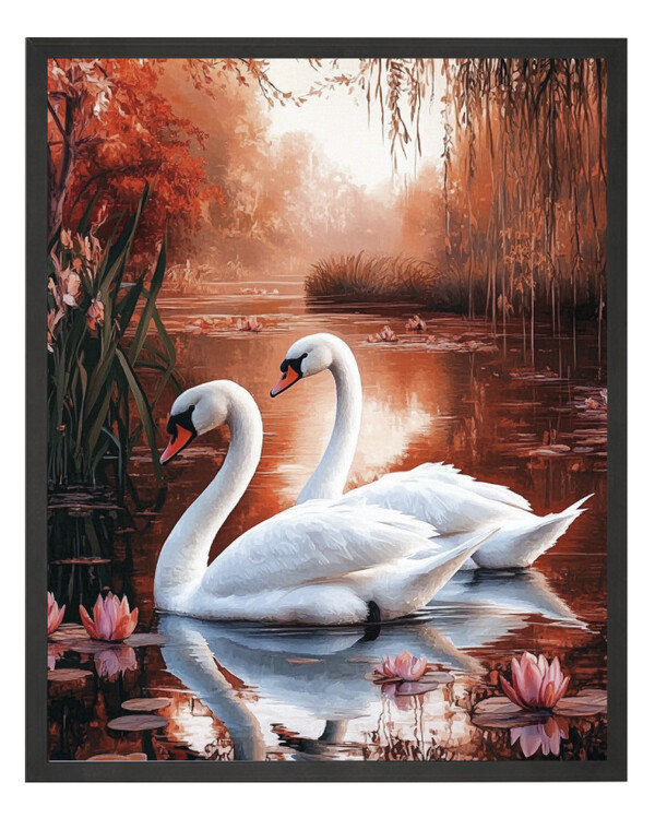 Ett vackert och stämningsfullt motiv med två vita svanar som glider över ett stilla vatten fyllt av näckrosor, badande i solens varma ljus.