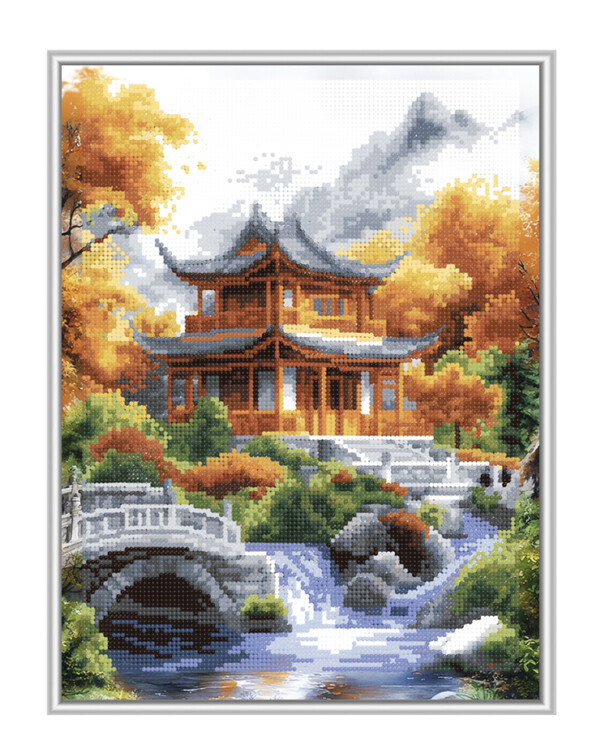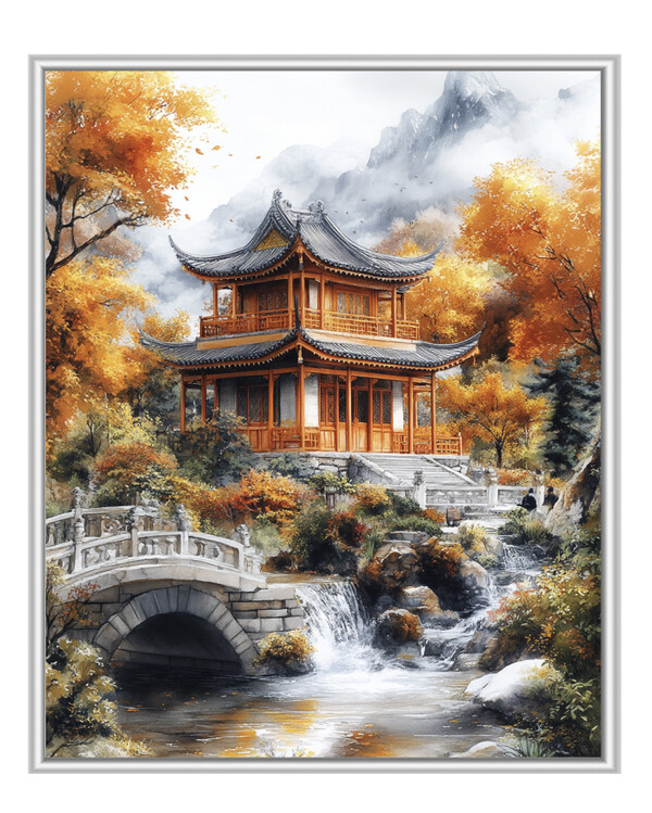 Ett harmoniskt motiv med ett traditionellt asiatisk tempel omringat av gyllene höstträd, stenbroar och ett porlande vattenfall.